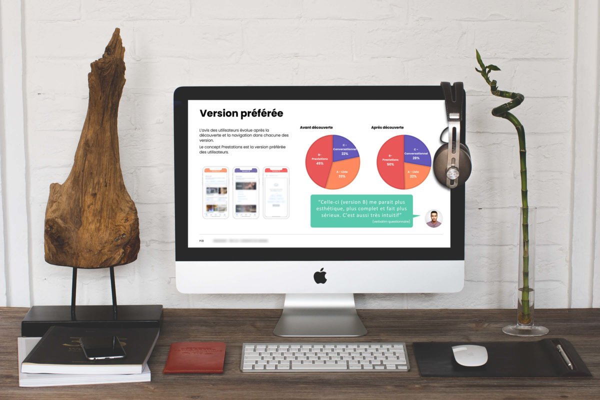 - Conception de stratégies de tests sur 8 méthodologies : tests d’utilisabilité modérés/non modérés, tests de préférence, enquêtes comportementales, évaluations UX Attrakdiff